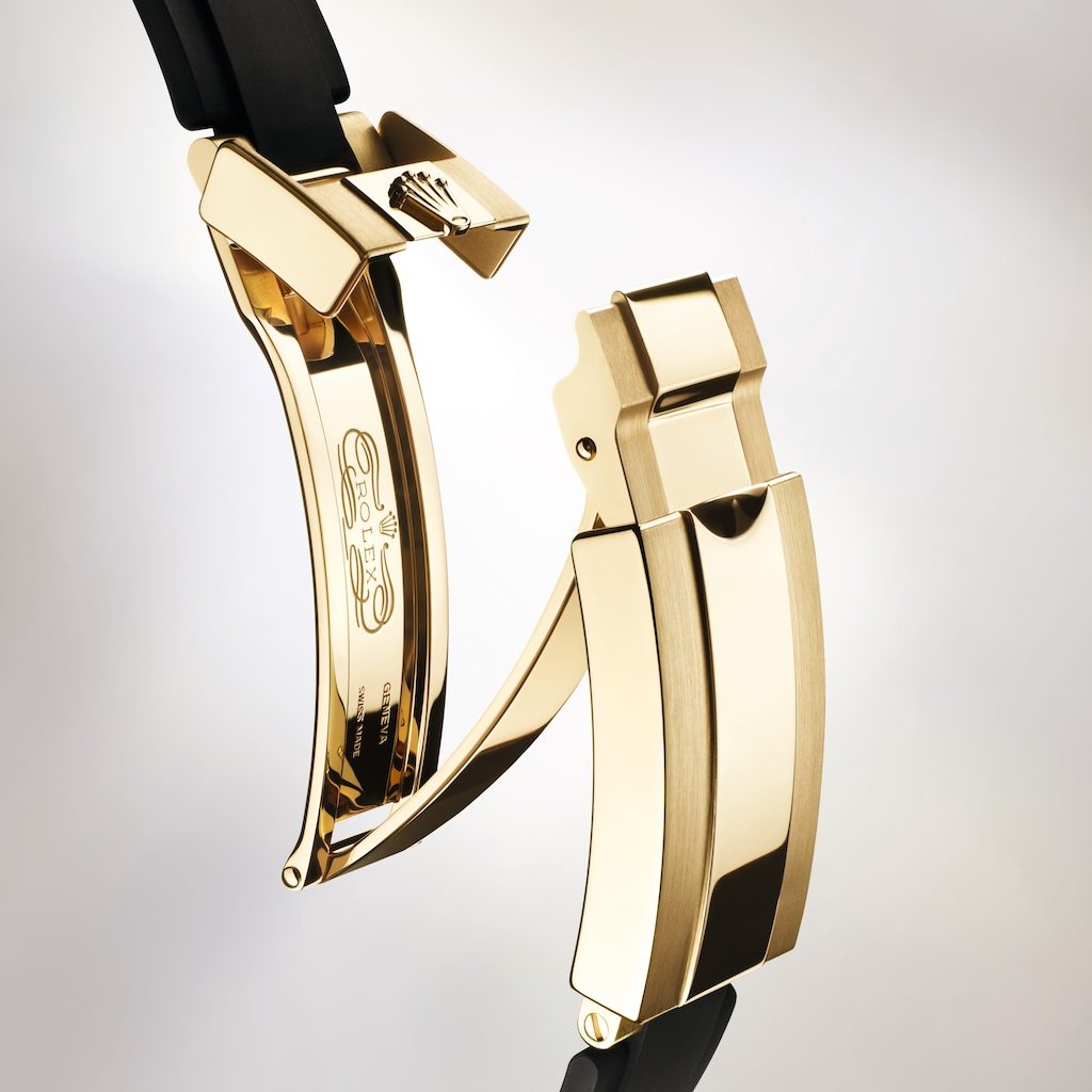 The Oysterflex bracelet comes with a Oysterlock folding safety clasp in 18k yellow gold and the Rolex Glidelock extension system that allows to adjust the length up to 15 mm without the use of any tools.